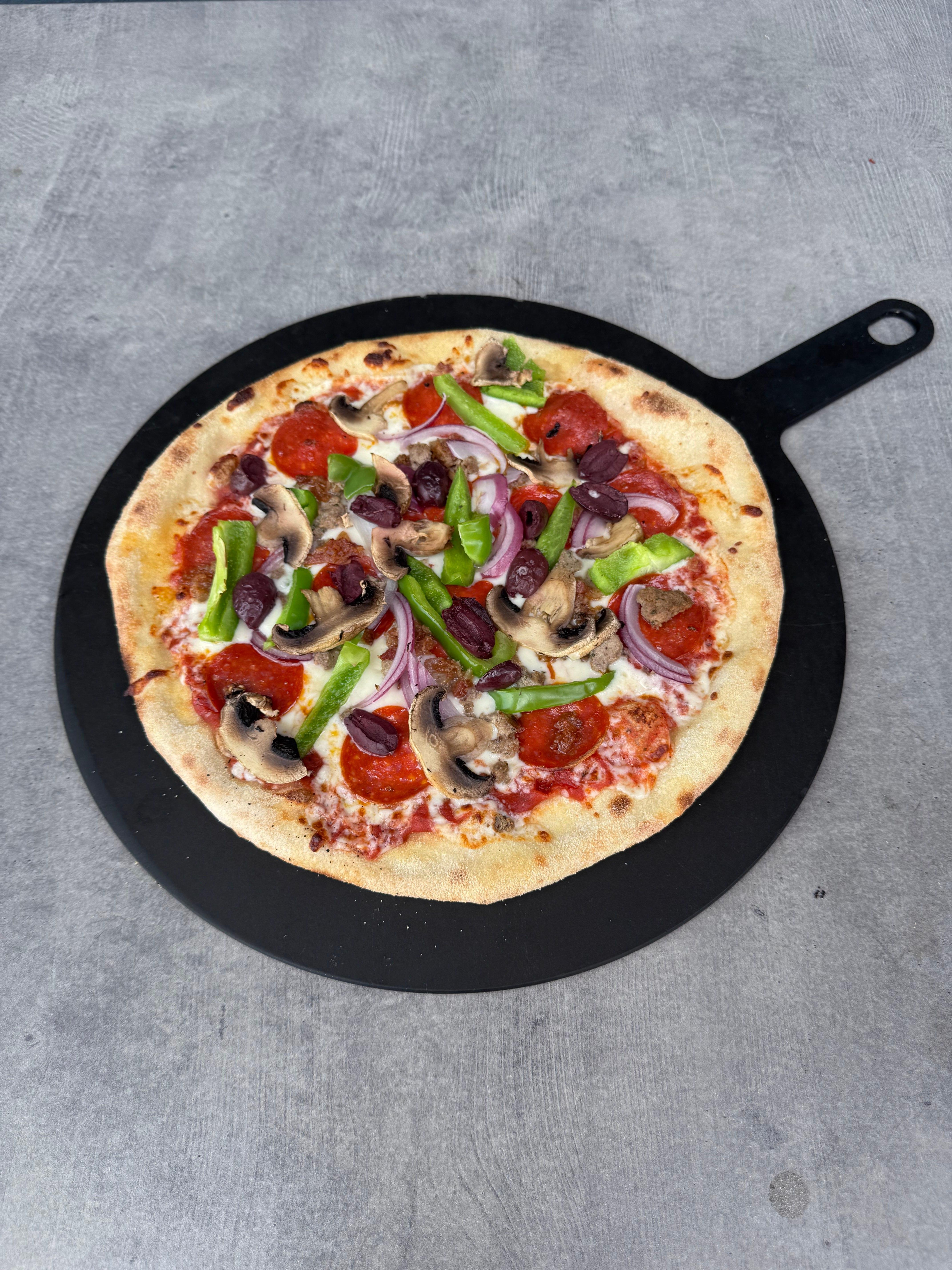 tomato sauce, shredded mozzarella, sausage, pepperoni, meatball, green peppers, olives, mushrooms, red onion